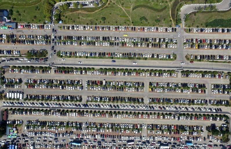 景区内各大停车场内也是密密麻麻,近万辆汽车停放在一起,犹如电路板,甚是壮观。